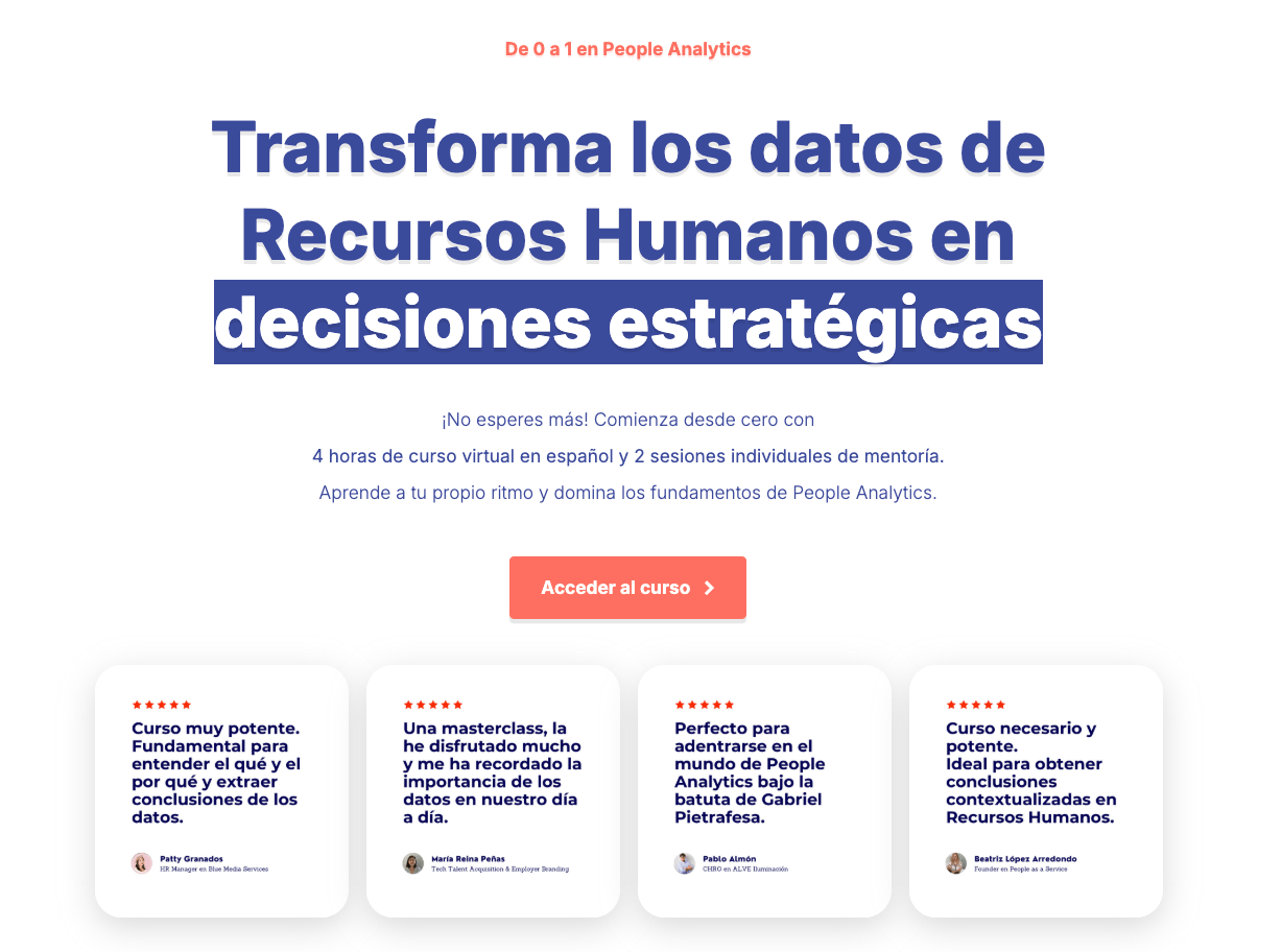 Curso de 0 a 1 en People Analytics: Mi curso online de introducción a People Analytics. A tu ritmo, con ejemplos de casos reales y sin necesidad de conocimientos técnicos previos.